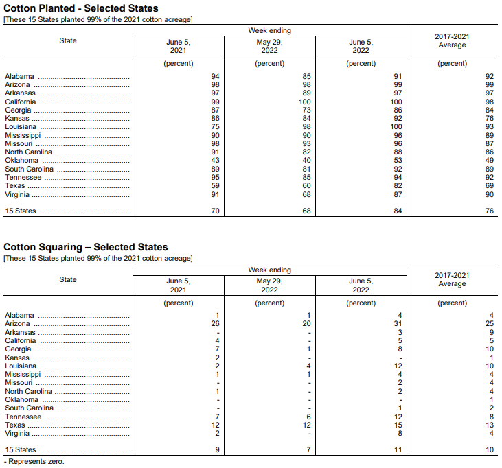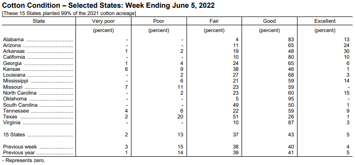 美國農業(yè)部6月6日發(fā)布的美國棉花生長報告顯示,截至6月5日當周,美棉種植率為84%,前周為68%,去年同期為70%,五年均值為76%。美棉現(xiàn)蕾率為11%,前周為7%,去年同期為9%,五年均值為10%。美棉生長優(yōu)良率為48%,前周為44%,去年同期為46%。