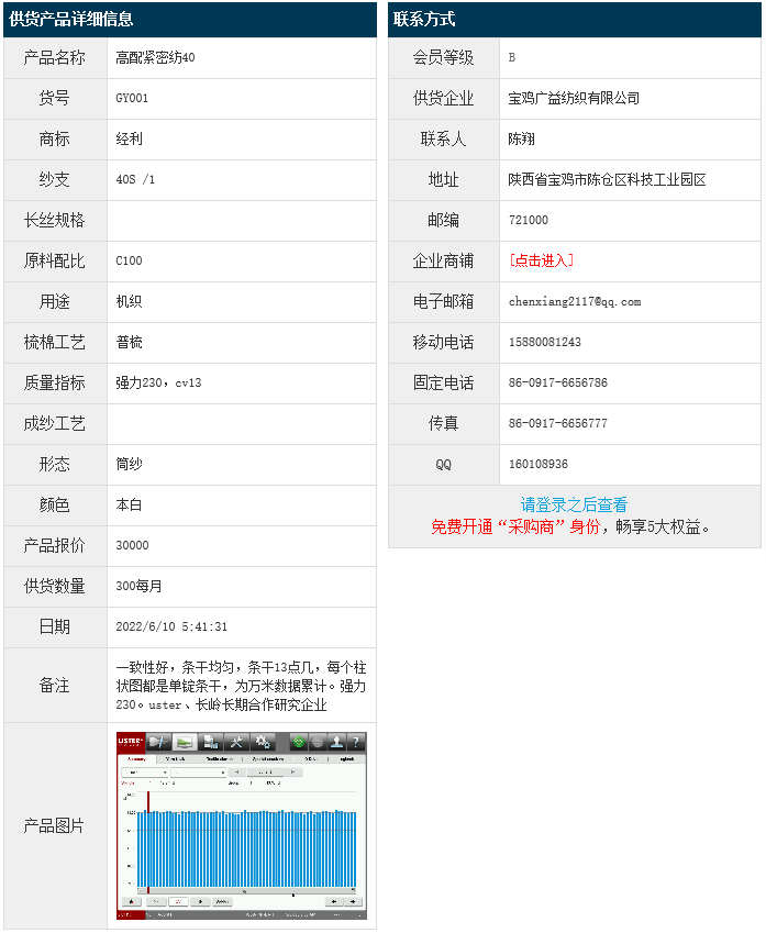 6月9日,寶雞廣益紡織有限公司機(jī)織高配緊密紡純棉紗C100 40S 強(qiáng)力230 cv13,報(bào)價(jià)為30000元/噸,實(shí)際成交價(jià)以協(xié)商為準(zhǔn)。[點(diǎn)擊查看詳情]