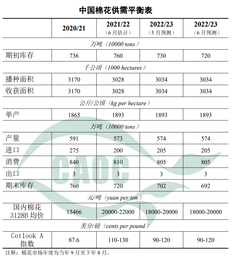 本月預(yù)測(cè),2022/23年度棉花供需數(shù)據(jù)與上月保持不變。當(dāng)前新疆棉花處第五真葉至現(xiàn)蕾期,黃河流域和長江流域大部處第三真葉至第五真葉期,全國棉區(qū)綜合氣象條件適宜,棉花長勢(shì)總體良好,后期將持續(xù)關(guān)注氣候?qū)萎a(chǎn)的影響。