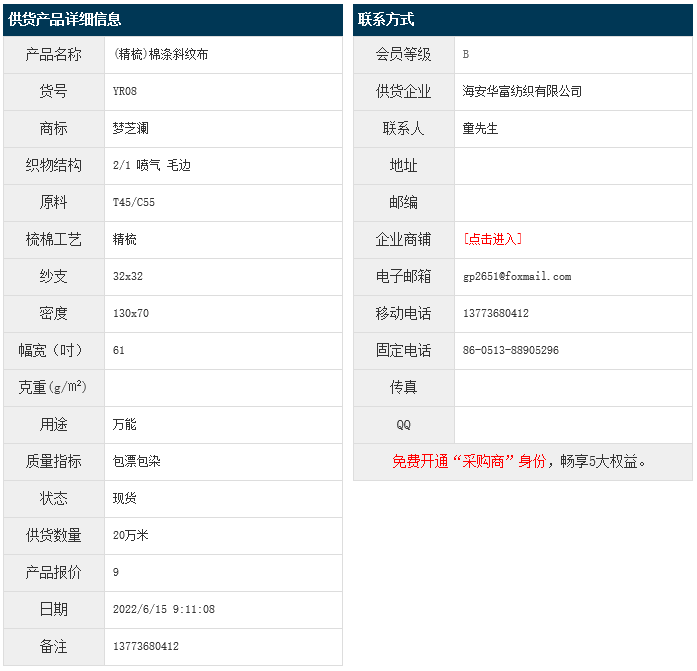 6月15日,海安華富紡織有限公司棉滌斜紋布JCVC55/45 32x32 130x70 61" 2/1 噴氣 毛邊,報價為9元/米,實際成交價以協(xié)商為準(zhǔn)。[點擊查看詳情]