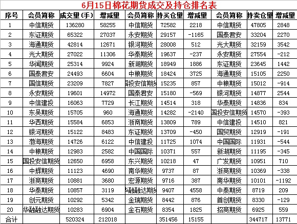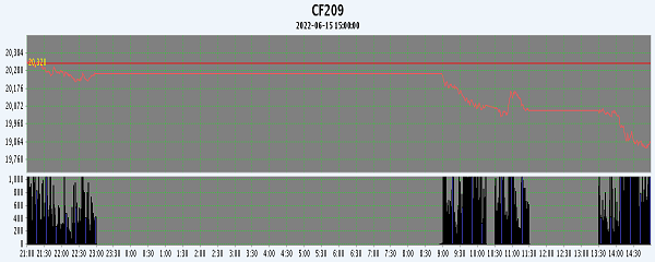 6月15日,周二紐約棉花期貨收跌,隔夜鄭棉低開增倉下行,今日盤中受空頭持續(xù)增倉打壓下滑,日線形成長陰線。日內(nèi)成交量放大,持倉量增加。