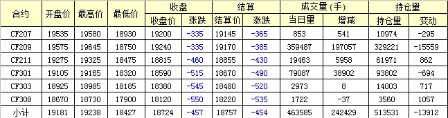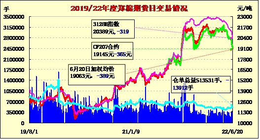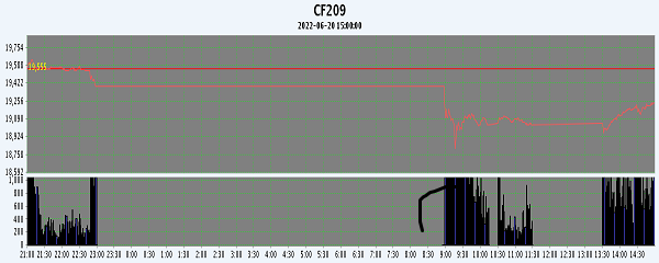 6月20日,上周五紐約棉花期貨收跌,隔夜鄭棉CF09、01合約平開橫盤,今日早盤在外棉下跌的帶動(dòng)下快速下滑,隨后在空頭回補(bǔ)盤支撐下回升,日線形成1/2下影線的長(zhǎng)陰線。日內(nèi)成交量創(chuàng)新高,持倉(cāng)量減少。