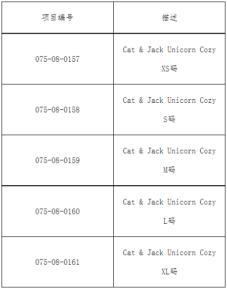 此次召回產(chǎn)品為兒童睡衣套裝。產(chǎn)品為兩件式長袖上衣和褲子套裝,采用“UnicornCozy”圖案,品牌為“Cat&Jack”。睡衣上衣為黑色,飾有象牙獨角獸和象牙星星,上面用金屬金字印有“DreamAway”字樣。睡衣褲子為象牙色,飾有黑色獨角獸和黑色星星。產(chǎn)品為100%聚酯纖維制成,尺碼為XS,S,M,L和XL號。睡衣上衣和褲子的內(nèi)縫側(cè)縫標(biāo)簽上都印有產(chǎn)品項目編號,具體信息如下: