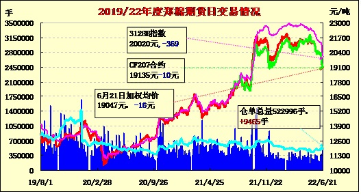6月21日,隔夜鄭棉CF09、01合約探低回升,今日早盤高位震蕩換手,隨后平倉盤壓制期價下滑,午后空頭增倉打壓期價收跌,日線形成陰線。日內(nèi)成交量下降,持倉量增加。最近棉花期貨大跌,對棉紗銷售影響很大,很多客戶不敢接貨,市場成交極為清淡。棉紗價格從上周五到現(xiàn)在持續(xù)下調(diào),跌幅大的可達500-600元/噸,前期成交的單子出現(xiàn)了個別毀約現(xiàn)象。同時由于下游拿貨謹慎,棉紗累庫有所增加。雖然棉價大跌后,紡企紡紗理論利潤有所好轉,但由于很多紡企原料庫存成本仍在21000-22000元/噸之間甚至更高,短期難以攤平原料成本,隨著紗價的下調(diào),虧損程度反而在擴大,一些紗廠不得不下調(diào)了開工率。