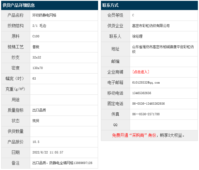 6月22日,高密彩虹紡織有限公司純棉防靜電網(wǎng)格C100 32x32 130x70 63" 2/1 毛邊,報(bào)價(jià)為10.5元/米,實(shí)際成交價(jià)以協(xié)商為準(zhǔn)。[點(diǎn)擊查看詳情]