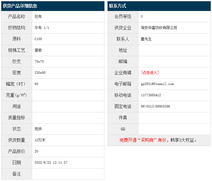 6月22日,海安華富紡織有限公司純棉平布C100 70x70 230x90 60" 1/1,報(bào)價(jià)為20元/米,實(shí)際成交價(jià)以協(xié)商為準(zhǔn)。[點(diǎn)擊查看詳情]