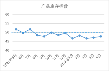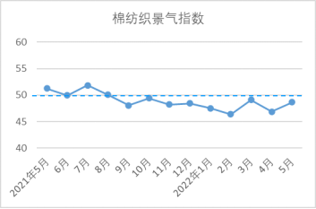 5月,產(chǎn)品庫存指數(shù)47.73,較4月上升0.61。據(jù)中棉行協(xié)調(diào)研了解,5月下旬,各地物流狀況逐步緩解,企業(yè)出貨速度回升。超半數(shù)企業(yè)紗布庫存在1個月以上,約30%企業(yè)坯布庫存在1個月以上,均較5月中上旬下降。當月,紗庫存量指數(shù)為47.04,較4月上升0.15;布庫存量指數(shù)為48.77,較4月上升1.31。可以看出,坯布庫存略好于紗線。