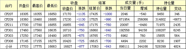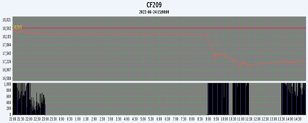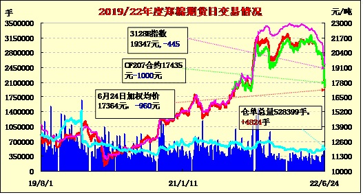6月24日,周四紐約棉花期貨大跌,隔夜鄭棉CF09、01合約低開震蕩,今日盤中加速下跌,01合約盤中觸及跌停,午后低位震蕩,日線形成長陰線。日內(nèi)成交量放大,持倉量近減遠增。美聯(lián)儲主席鮑威爾再度在聽證會上表示,將繼續(xù)加息打贏物價攻堅戰(zhàn),但美國經(jīng)濟有可能陷入衰退。目前市場對于遏制通脹的同時,是否能令經(jīng)濟和失業(yè)率保持穩(wěn)定而感到擔憂,外圍能源谷物市場持續(xù)收跌,美元指數(shù)上漲,棉價承壓下挫。