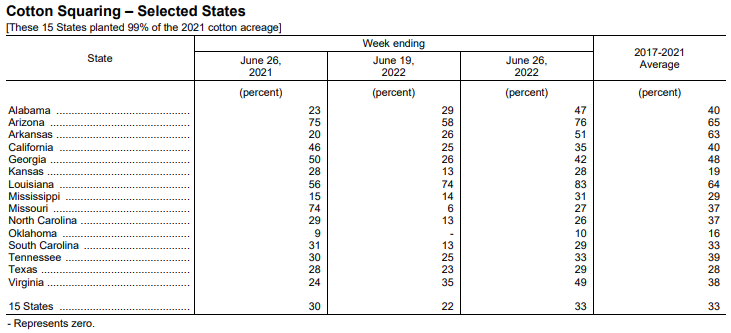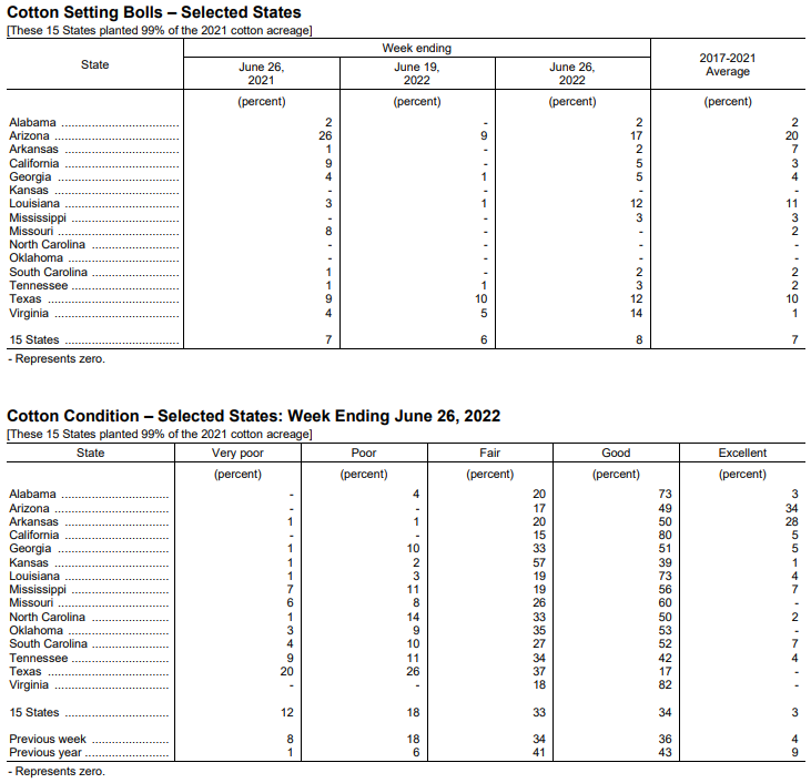 美國農(nóng)業(yè)部6月27日發(fā)布的美國棉花生長報告顯示,截至6月26日當周,美棉現(xiàn)蕾率為33%,前周為22%,去年同期為30%,五年均值為33%。美棉結(jié)鈴率為8%,前周為6%,去年同期為7%,五年均值為7%,美棉生長優(yōu)良率為37%,前周為40%,去年同期為52%。