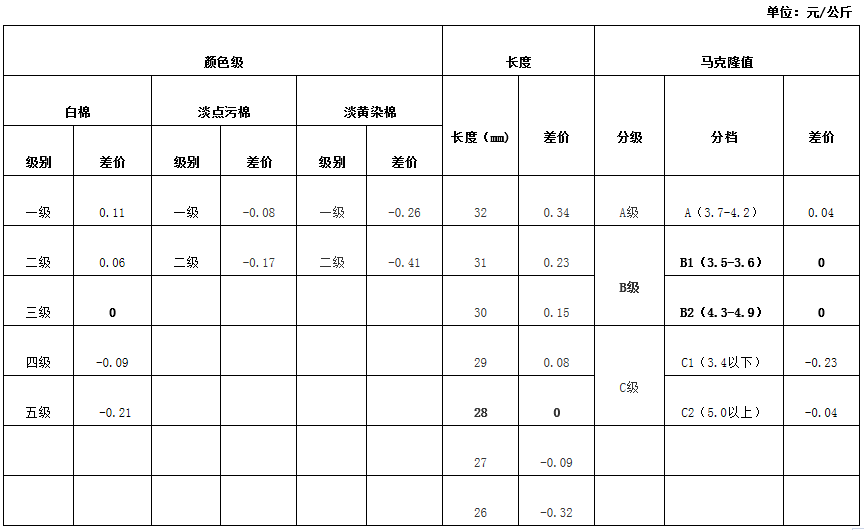 根據(jù)《中國(guó)棉花協(xié)會(huì)籽棉收購(gòu)結(jié)算差價(jià)參考表(新疆細(xì)絨棉)管理辦法》規(guī)定,依據(jù)中國(guó)棉花協(xié)會(huì)發(fā)布的2022年7月《鋸齒加工細(xì)絨棉質(zhì)量差價(jià)表》和中國(guó)棉花預(yù)警系統(tǒng)2021年9月至2022年1月新疆籽棉收購(gòu)平均衣分率數(shù)據(jù),折算得出籽棉收購(gòu)差價(jià),現(xiàn)正式發(fā)布2022年7月《籽棉收購(gòu)結(jié)算差價(jià)參考表(新疆細(xì)絨棉)》(單位:元/公斤),為新疆地區(qū)籽棉收購(gòu)工作提供參考。