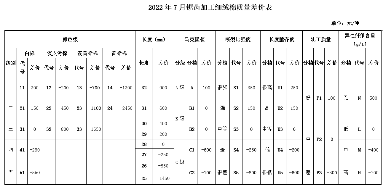 根據(jù)《中國(guó)棉花協(xié)會(huì)國(guó)產(chǎn)棉質(zhì)量差價(jià)表管理辦法》規(guī)定,現(xiàn)正式發(fā)布2022年7月《鋸齒加工細(xì)絨棉質(zhì)量差價(jià)表》、《皮輥加工細(xì)絨棉質(zhì)量差價(jià)表》和《長(zhǎng)絨棉質(zhì)量差價(jià)表》(單位:元/噸)。