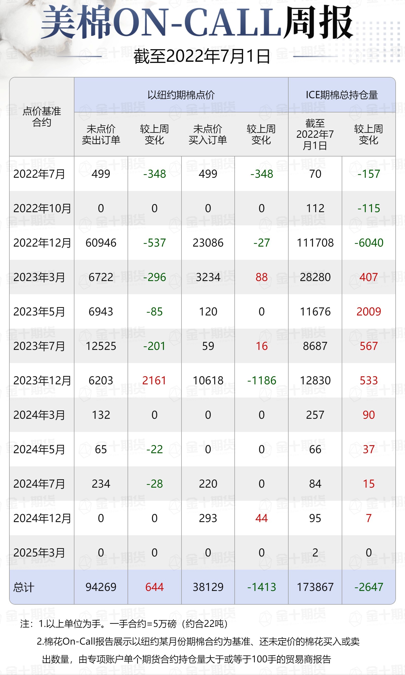 據(jù)美國(guó)商品期貨交易委員會(huì)(CFTC)最新數(shù)據(jù),截至7月1日,①美棉On-Call未點(diǎn)價(jià)賣出訂單94269手,環(huán)比增加644手;未點(diǎn)價(jià)買入訂單38129手,環(huán)比減少1413手;②ICE期棉2207合約上賣方未點(diǎn)價(jià)合約為499手,較此前一周減少348手;③ICE棉花期貨盤面2021/22年度(8月至次年7月)的On-Call合約未點(diǎn)價(jià)賣出訂單為499手,環(huán)比減少348手。