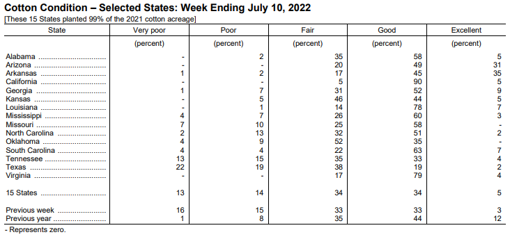 美國農(nóng)業(yè)部7月11日發(fā)布的美國棉花生長報告顯示,截至7月10日當周,美棉現(xiàn)蕾率為57%,前周為44%,去年同期為53%,五年均值為58%。美棉結鈴率為22%,前周為13%,去年同期為15%,五年均值為18%,美棉生長優(yōu)良率為39%,前周為36%,去年同期為56%。