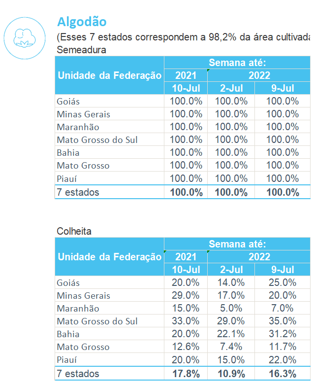 據(jù)巴西農(nóng)業(yè)部下屬的國家商品供應(yīng)公司CONAB,截至7月9日,巴西棉花收割率為16.3%,上周為10.9%,去年同期為17.8%。