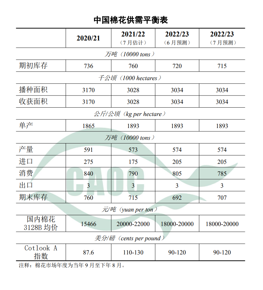 本月對2022/23年度中國棉花產(chǎn)量和進(jìn)口量預(yù)測數(shù)據(jù)維持上月不變。至6月末,新疆棉花大部處開花期,長江、黃河流域棉區(qū)大部處第五真葉至現(xiàn)蕾期。全國棉區(qū)綜合氣象條件較適宜,棉花長勢總體良好。在俄烏沖突、美聯(lián)儲(chǔ)擴(kuò)大加息幅度等因素影響下,全球經(jīng)濟(jì)減速預(yù)期增強(qiáng),拖累棉紡織品終端消費(fèi),預(yù)計(jì)新年度中國棉花消費(fèi)量為785萬噸,較上月調(diào)減20萬噸,期末庫存增至707萬噸。