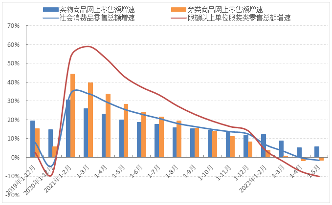 5月,在疫情防控形勢總體向好及促消費等政策落地顯效的共同作用下,國內(nèi)市場需求逐步好轉(zhuǎn),服裝內(nèi)銷降幅收窄,實體和線上零售均有所改善。據(jù)國家統(tǒng)計局數(shù)據(jù),5月當(dāng)月限額以上單位服裝類商品零售額同比下降20.1%,降幅比4月收窄5.5個百分點;1-5月我國限額以上單位服裝類商品零售額累計3623.3億元,同比下降10.1%,降幅比1-4月繼續(xù)擴大2.6個百分點。據(jù)中華全國商業(yè)信息中心數(shù)據(jù),5月全國重點大型零售企業(yè)服裝零售額同比下降29.94%,降幅比4月收窄9.92個百分點。同時,物流通暢程度、運輸效率的不斷提升,對線上消費起到一定的拉動作用。1-5月穿類商品網(wǎng)上零售額同比下降1.6%,降幅比1-4月收窄0.1個百分點。