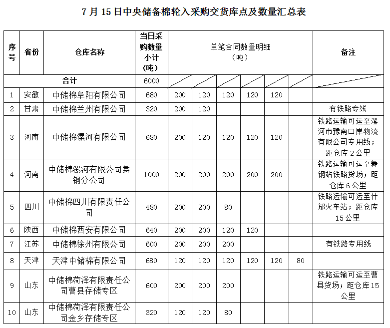 附件:7月15日中央儲(chǔ)備棉輪入采購交貨庫點(diǎn)及數(shù)量匯總表