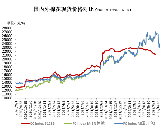 6月,美聯(lián)儲(chǔ)大幅度加息引發(fā)大經(jīng)濟(jì)衰退的擔(dān)憂,能源和谷物等在內(nèi)的大宗商品價(jià)格均大幅走弱,受此影響,國(guó)際棉價(jià)承壓下行,但跌幅相對(duì)較小。中國(guó)進(jìn)口棉價(jià)格指數(shù)FCIndexM月均154.95美分/磅,環(huán)比下跌6.79美分;月底143.12美分/磅,環(huán)比下跌12.86美分,1%關(guān)稅下折人民幣23619元/噸,高于同期國(guó)內(nèi)現(xiàn)貨5250元,內(nèi)外棉價(jià)價(jià)差繼續(xù)大幅擴(kuò)大。