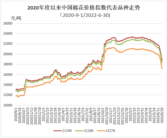 6月,國(guó)內(nèi)棉花市場(chǎng)延續(xù)弱勢(shì),前半月棉價(jià)緩慢走低,后半月加速下跌,28日以18325元/噸創(chuàng)今年以來(lái)最低。隨著“雙結(jié)零”日期的臨近,棉企還貸壓力加大,多降價(jià)促銷;紡織廠淡季持續(xù),開機(jī)率不足,下游訂單減弱,皮棉需求以剛需為主,隨用隨買,整體購(gòu)銷進(jìn)度持續(xù)緩慢。月末,中國(guó)棉花價(jià)格指數(shù)(CCIndex3128B)18369元/噸,環(huán)比下跌3150元;月均價(jià)20402元/噸,環(huán)比下跌1720元,同比上漲4417元。