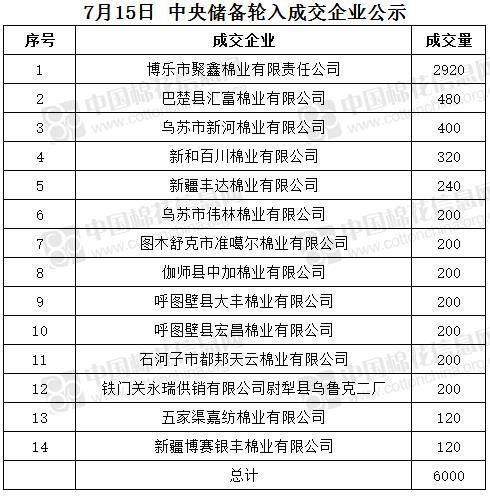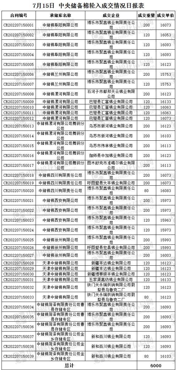 7月15日,中國儲備棉管理有限公司掛牌采購棉花6000噸(公定重量),實(shí)際成交6000噸,成交率100%,成交均價(jià)16057元/噸,成交最高價(jià)16133元/噸,成交最低價(jià)15753元/噸。