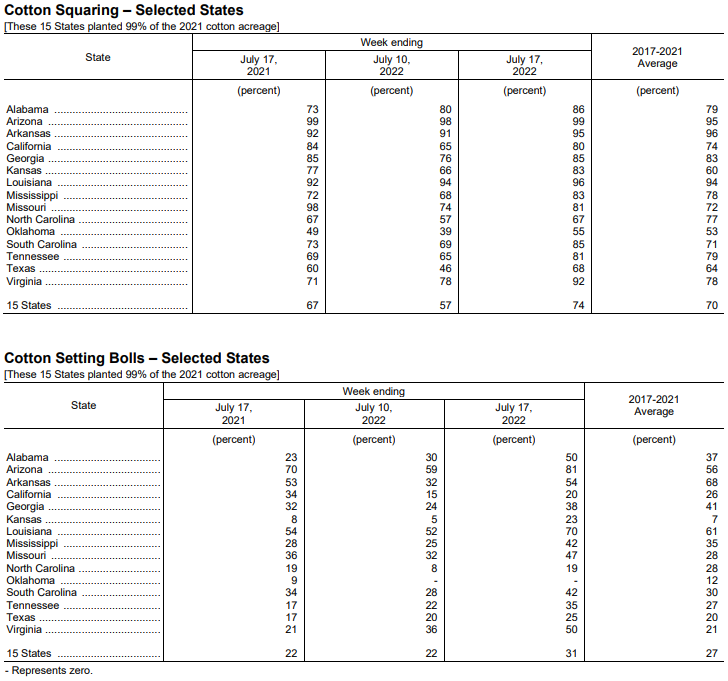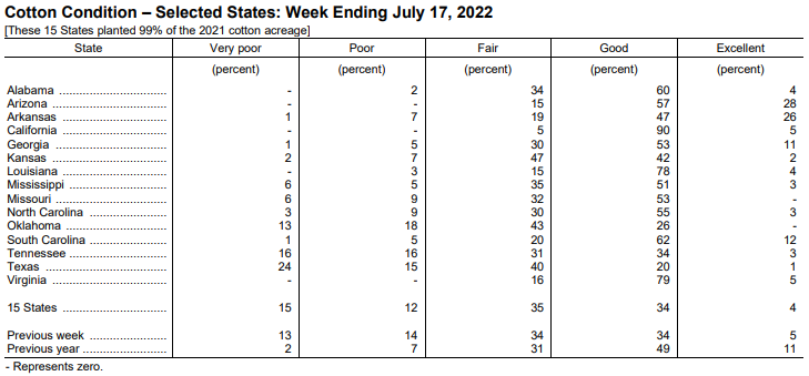 美國農(nóng)業(yè)部7月18日發(fā)布的美國棉花生長報(bào)告顯示,截至7月17日當(dāng)周,美棉現(xiàn)蕾率為74%,前周為57%,去年同期為67%,五年均值為70%。美棉結(jié)鈴率為31%,前周為22%,去年同期為22%,五年均值為27%,美棉生長優(yōu)良率為38%,前周為39%,去年同期為60%。
