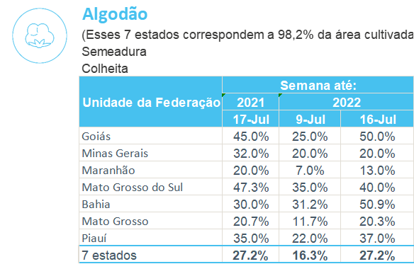 據(jù)巴西農(nóng)業(yè)部下屬的國家商品供應公司CONAB,截至7月16日,巴西棉花收割率為27.2%,上周為16.3%,去年同期為27.2%。