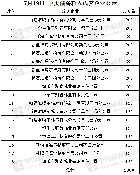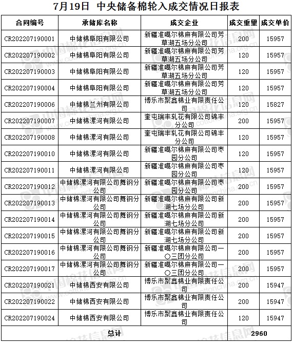 7月19日,中國(guó)儲(chǔ)備棉管理有限公司掛牌采購(gòu)棉花6000噸(公定重量),實(shí)際成交2960噸,成交率49%,成交均價(jià)15950元/噸,成交最高價(jià)15957元/噸,成交最低價(jià)15827元/噸。