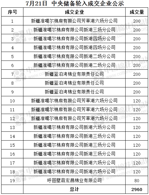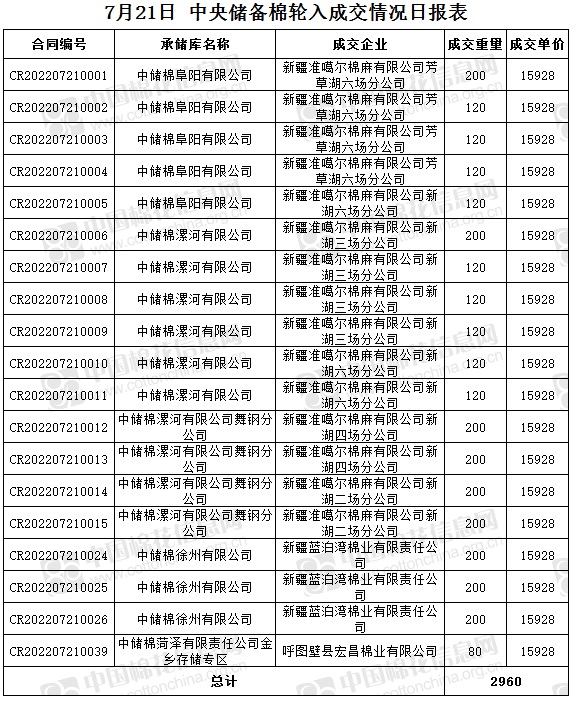 7月21日,中國儲備棉管理有限公司掛牌采購棉花6000噸(公定重量),實際成交2960噸,成交率49%,成交均價15928元/噸,成交最高價15928元/噸,成交最低價15928元/噸。