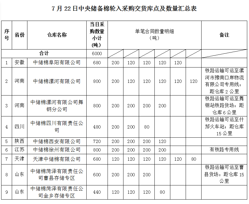 中國儲備棉管理有限公司定于2022年7月22日采購棉花6000噸(公定重量)。具體庫點及數(shù)量如下: