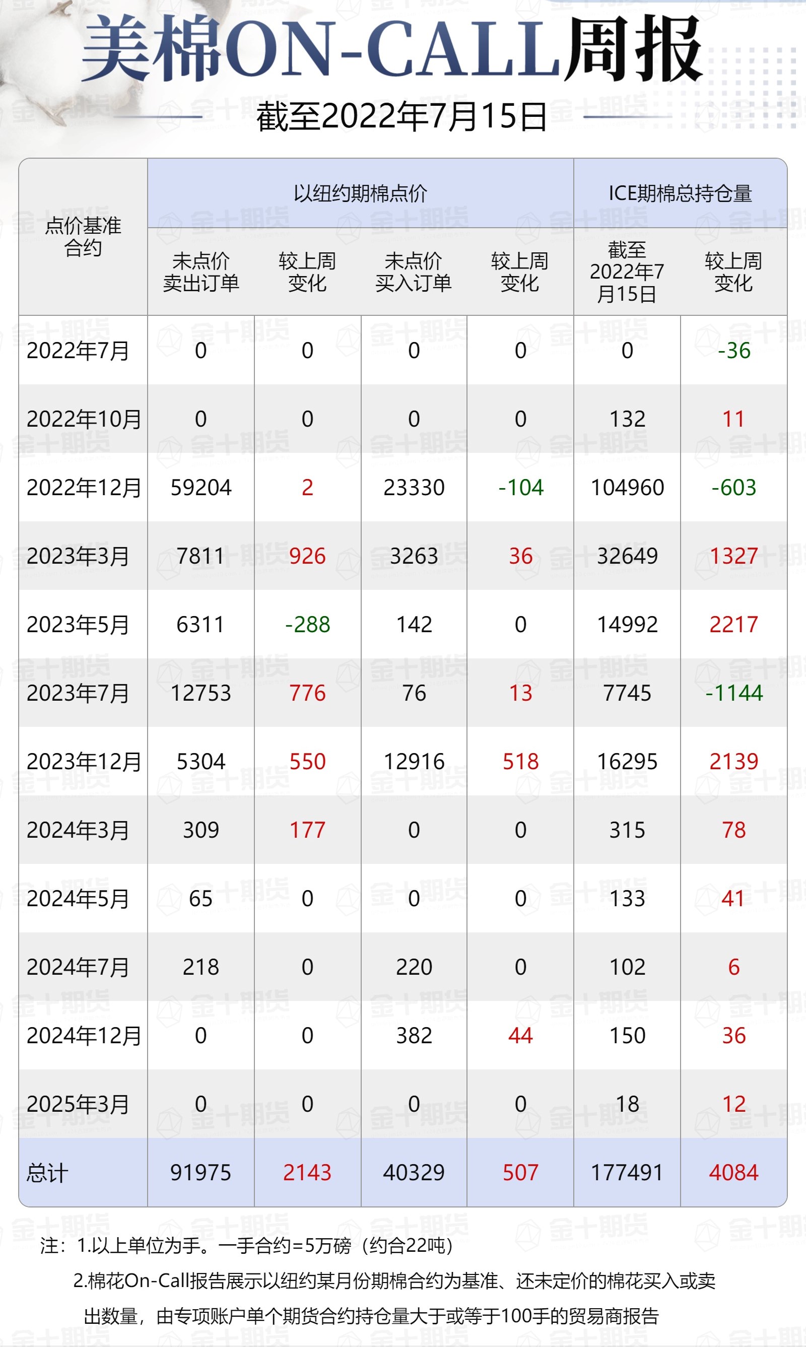 據(jù)美國(guó)商品期貨交易委員會(huì)(CFTC)最新數(shù)據(jù),截至7月15日,①美棉On-Call未點(diǎn)價(jià)賣出訂單91975手,環(huán)比增加2143手;未點(diǎn)價(jià)買入訂單40329手,環(huán)比增加507手;②ICE期棉2207合約上賣方未點(diǎn)價(jià)合約為0手,較此前一周增加0手;③ICE棉花期貨盤面2021/22年度(8月至次年7月)的On-Call合約未點(diǎn)價(jià)賣出訂單為0手,環(huán)比增加0手。