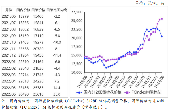 (二)國(guó)際棉價(jià)止?jié)q回落。本月上旬,受美棉出口簽約活躍,美國(guó)西南棉區(qū)旱情引發(fā)減產(chǎn)預(yù)期等因素影響,國(guó)際棉價(jià)小幅上行。中下旬,受美聯(lián)儲(chǔ)大幅加息的影響,全球大宗商品和能源價(jià)格明顯回落,拖累國(guó)際棉價(jià)止?jié)q轉(zhuǎn)跌。6月份,CotlookA指數(shù)(相當(dāng)于國(guó)內(nèi)3128B級(jí)棉花)月均價(jià)每磅154.95美分,環(huán)比跌5.9%,同比漲64.3%。受人民幣對(duì)美元匯率上升影響,進(jìn)口棉價(jià)格指數(shù)(FCIndex)M級(jí)(相當(dāng)于國(guó)內(nèi)3128B級(jí)棉花)到岸稅后價(jià)(滑準(zhǔn)稅下)每噸25610元,環(huán)比漲0.9%,同比漲65.7%。