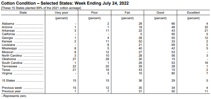 美國農(nóng)業(yè)部7月25日發(fā)布的美國棉花生長報告顯示,截至7月24日當(dāng)周,美棉現(xiàn)蕾率為80%,前周為74%,去年同期為77%,五年均值為80%。美棉結(jié)鈴率為48%,前周為31%,去年同期為35%,五年均值為38%,美棉生長優(yōu)良率為34%,前周為38%,去年同期為60%。