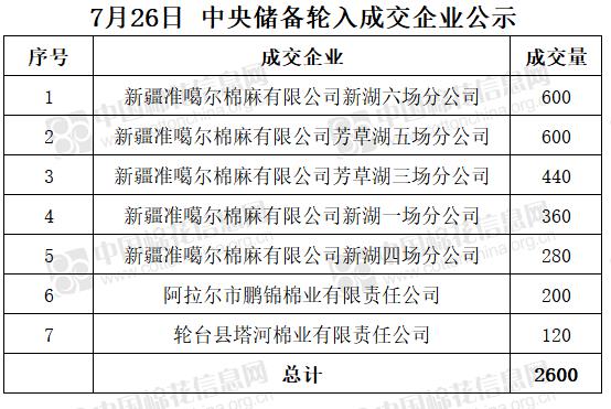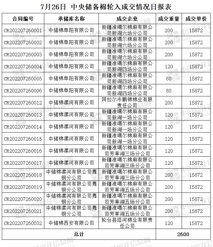 7月26日,中國儲備棉管理有限公司掛牌采購棉花6000噸(公定重量),實際成交2600噸,成交率43%,成交均價15872元/噸,成交最高價15872元/噸,成交最低價15872元/噸。