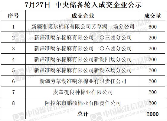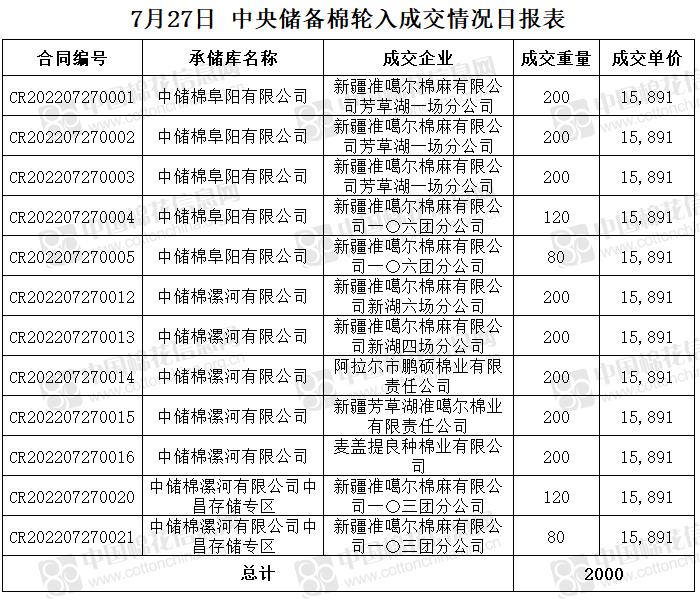 7月27日,中國(guó)儲(chǔ)備棉管理有限公司掛牌采購(gòu)棉花6000噸(公定重量),實(shí)際成交200噸,成交率33%,成交均價(jià)15891元/噸,成交最高價(jià)15891元/噸,成交最低價(jià)15891元/噸。