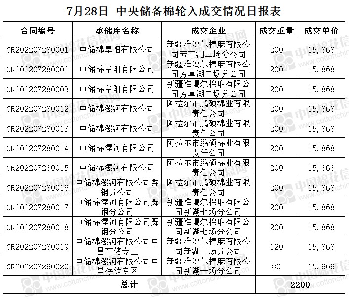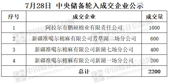 7月28日,中國(guó)儲(chǔ)備棉管理有限公司掛牌采購(gòu)棉花6000噸(公定重量),實(shí)際成交2200噸,成交率37%,成交均價(jià)15868元/噸,成交最高價(jià)15868元/噸,成交最低價(jià)15868元/噸。