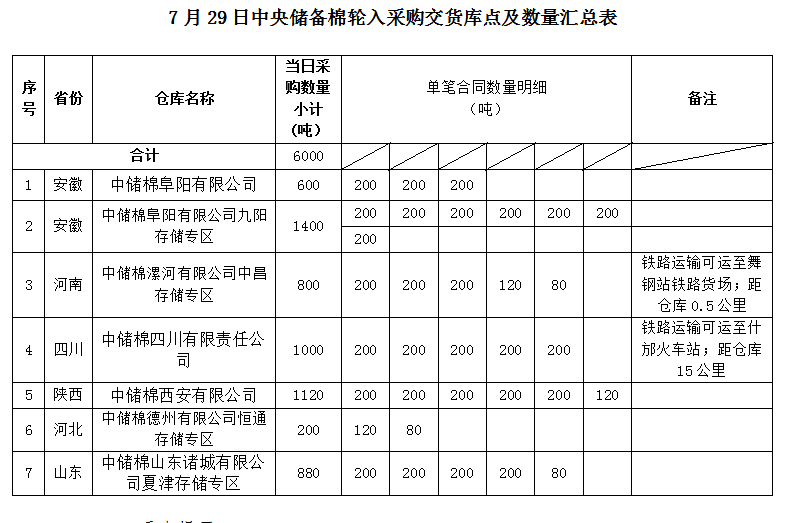 中國儲(chǔ)備棉管理有限公司定于2022年7月29日采購棉花6000噸(公定重量)。具體庫點(diǎn)及數(shù)量如下: