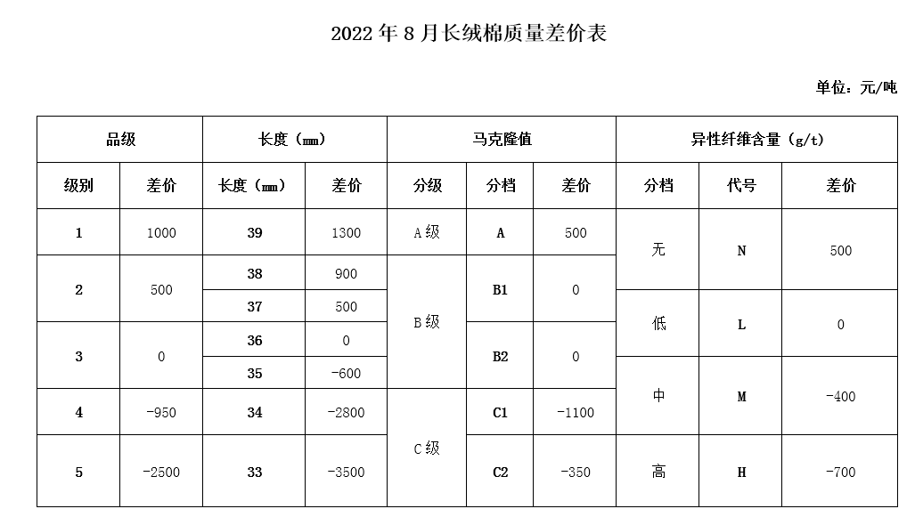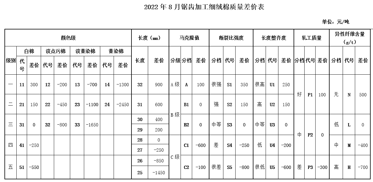 根據(jù)《中國(guó)棉花協(xié)會(huì)國(guó)產(chǎn)棉質(zhì)量差價(jià)表管理辦法》規(guī)定,現(xiàn)正式發(fā)布2022年8月《鋸齒加工細(xì)絨棉質(zhì)量差價(jià)表》、《皮輥加工細(xì)絨棉質(zhì)量差價(jià)表》和《長(zhǎng)絨棉質(zhì)量差價(jià)表》(單位:元/噸)。
