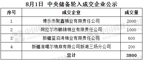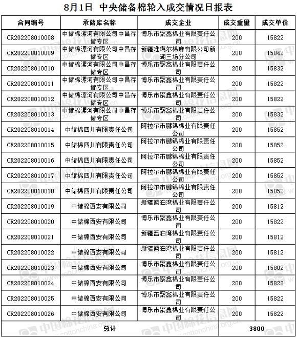 8月1日,中國儲(chǔ)備棉管理有限公司掛牌采購棉花6000噸(公定重量),實(shí)際成交3800噸,成交率63%,成交均價(jià)15829元/噸,成交最高價(jià)15852元/噸,成交最低價(jià)15802元/噸。