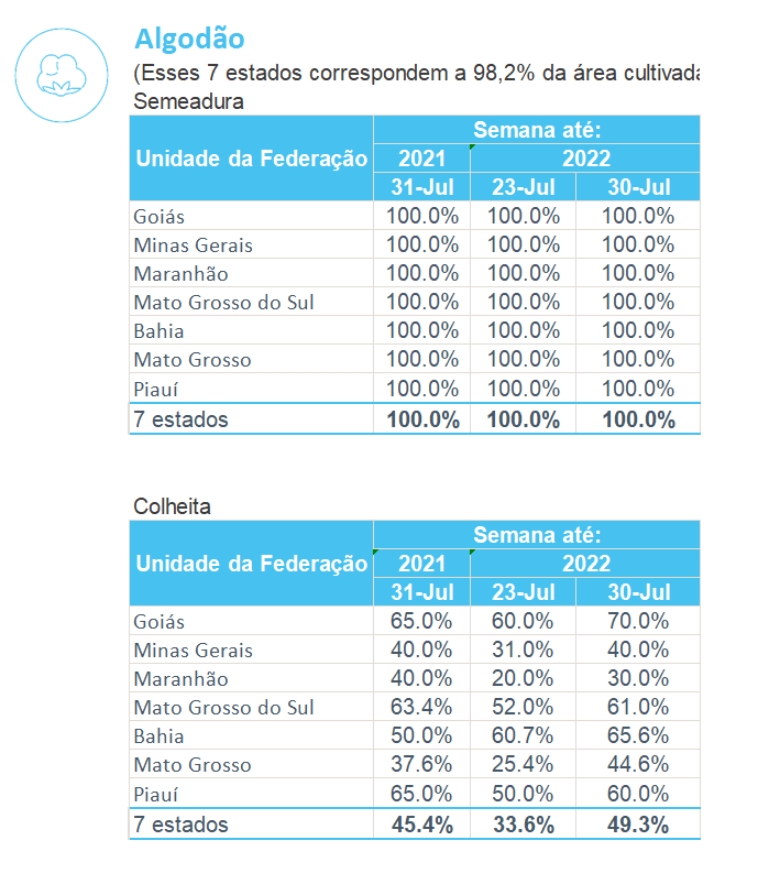 據(jù)巴西農(nóng)業(yè)部下屬的國家商品供應(yīng)公司CONAB,截至7月30日,巴西棉花收割率為49.3%,上周為33.6%,去年同期為45.4%。