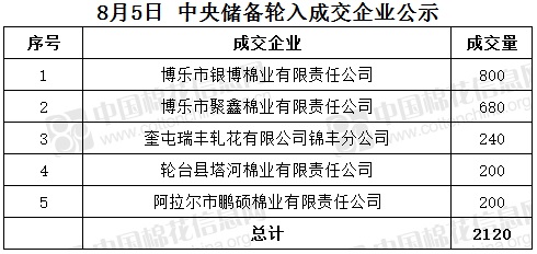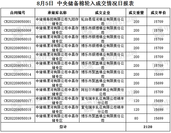 8月5日,中國儲備棉管理有限公司掛牌采購棉花6000噸(公定重量),實際成交2120噸,成交率35%,成交均價15706元/噸,成交最高價15709元/噸,成交最低價15699元/噸。