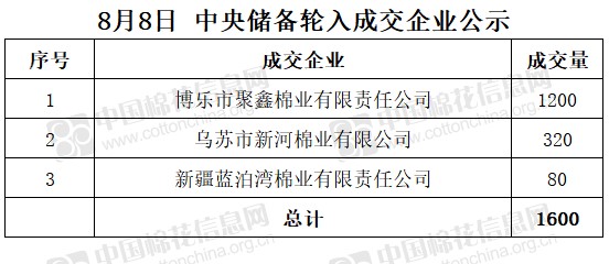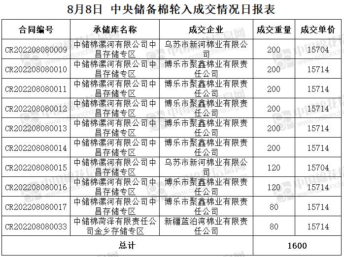 8月8日,中國儲備棉管理有限公司掛牌采購棉花6000噸(公定重量),實際成交1600噸,成交率27%,成交均價15712元/噸,成交最高價15714元/噸,成交最低價15704元/噸。