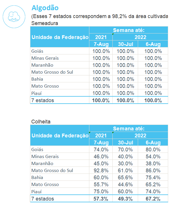 據(jù)巴西農(nóng)業(yè)部下屬的國家商品供應公司CONAB,截至8月6日,巴西棉花收割率為67.2%,上周為49.3%,去年同期為57.3%。