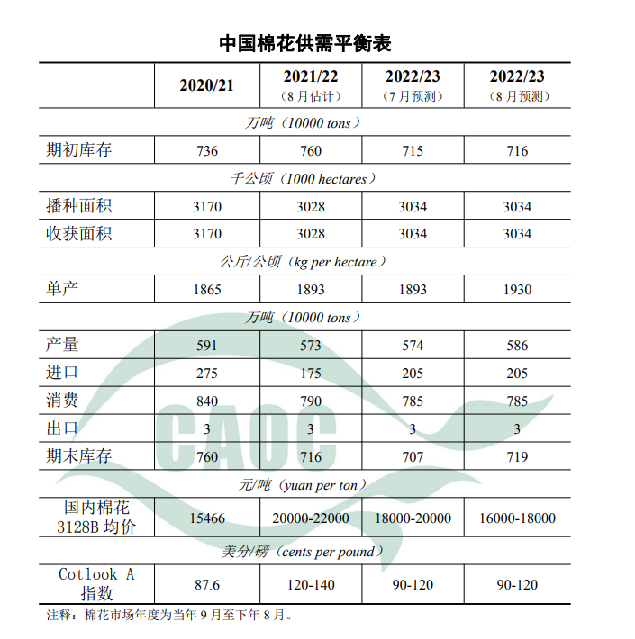 至7月末,棉花處開(kāi)花結(jié)鈴期,全國(guó)棉區(qū)綜合氣象條件適宜,病蟲(chóng)害輕度發(fā)生,棉花長(zhǎng)勢(shì)總體好于上年,增產(chǎn)預(yù)期明顯增強(qiáng),本月預(yù)測(cè),2022/23年度,單產(chǎn)調(diào)增至每公頃1930公斤(每畝128.7公斤),較上年度增2.0%,產(chǎn)量調(diào)增至586萬(wàn)噸。皮棉銷(xiāo)售進(jìn)度持續(xù)緩慢,據(jù)國(guó)家棉花市場(chǎng)監(jiān)測(cè)系統(tǒng)數(shù)據(jù),截至8月4日,全國(guó)皮棉銷(xiāo)售率為66.4%,同比降33.2個(gè)百分點(diǎn)。在棉花供給充足,需求難有起色態(tài)勢(shì)下,新年度棉價(jià)存在下行風(fēng)險(xiǎn),2022/23年度國(guó)內(nèi)棉價(jià)區(qū)間調(diào)整為每噸16000-18000元。