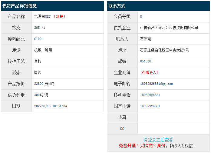 8月16日,中傳新合(河北)科技股份有限公司純棉紗OEC100 26S 包漂白,報價為22800元/噸,實(shí)際成交價以協(xié)商為準(zhǔn)。[點(diǎn)擊查看詳情]