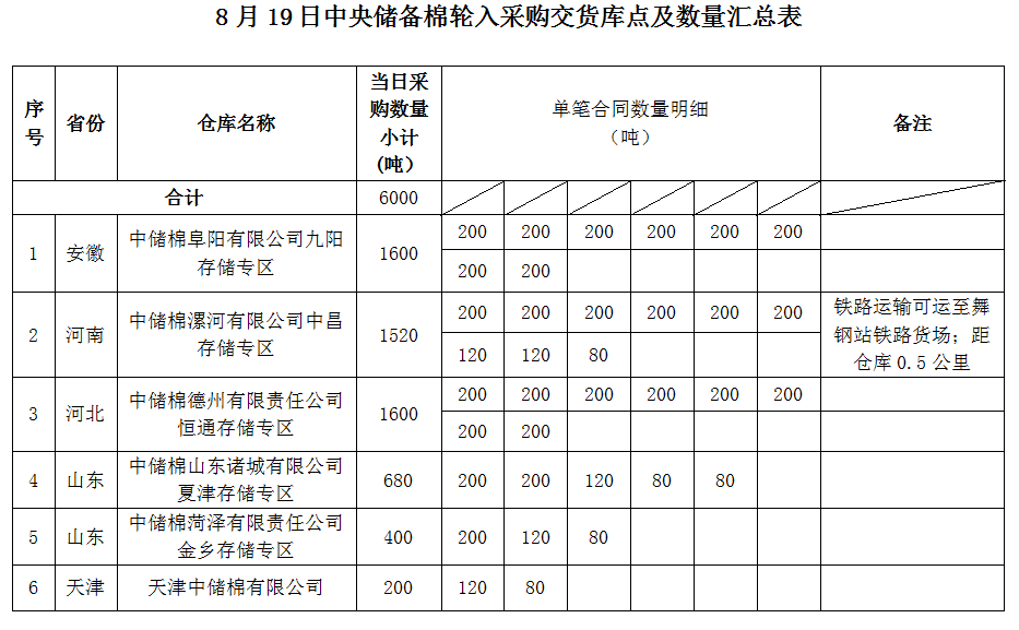 中國(guó)儲(chǔ)備棉管理有限公司定于2022年8月19日采購(gòu)棉花6000噸(公定重量)。具體庫(kù)點(diǎn)及數(shù)量如下: