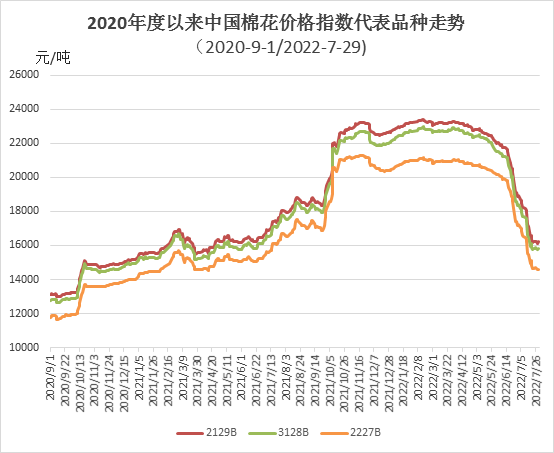 7月,國內(nèi)棉市延續(xù)弱勢,22日價格達(dá)到15807元/噸創(chuàng)今年以來新低。月內(nèi)儲備棉輪入啟動,由于價格較低,企業(yè)參與熱情不高,部分企業(yè)處觀望狀態(tài);紡織市場淡季持續(xù),高溫限電開機(jī)率不足,下游訂單無明顯增加,對皮棉原料逢低適量采購,整體購銷進(jìn)度依然緩慢。月末,中國棉花價格指數(shù)(CCIndex3128B)15818元/噸,環(huán)比下跌2551元;月均價16776元/噸,環(huán)比下跌3626元,同比下跌169元。