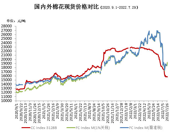 7月,美聯(lián)儲繼續(xù)加息75個基點(diǎn),國際市場對經(jīng)濟(jì)衰退擔(dān)心加大,供給端存在豐產(chǎn)預(yù)期,受此影響,國際棉價承壓下行。中國進(jìn)口棉價格指數(shù)FCIndexM月均118.49美分/磅,為新花指數(shù),環(huán)比下跌36.46美分;月底116.53美分/磅,環(huán)比下跌26.59美分,1%關(guān)稅下折人民幣19296元/噸,高于同期國內(nèi)現(xiàn)貨3478元,內(nèi)外棉價價差繼續(xù)大幅擴(kuò)大。