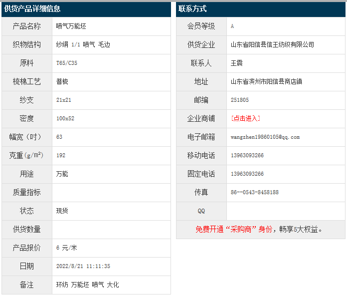 8月21日,山東陽信縣信王紡織有限公司大化滌棉紗絹T65/C35 21x21 100x52 63" 1/1 192g/㎡ 噴氣 毛邊,報價為6元/米,實際成交價以協(xié)商為準。[點擊查看詳情]