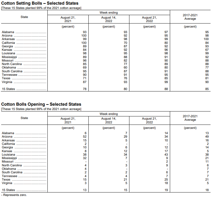 美國農(nóng)業(yè)部8月22日發(fā)布的美國棉花生長報告顯示,截至8月21日當(dāng)周,美棉結(jié)鈴率為88%,前周為80%,去年同期為78%,五年均值為85%。美棉盛鈴率為19%,前周為15%,去年同期為13%,五年均值為18%。美棉生長優(yōu)良率為31%,前周為34%,去年同期為71%。