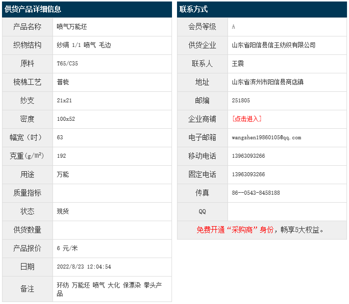 8月23日,山東陽(yáng)信縣信王紡織有限公司大化滌棉紗絹T65/C35 21x21 100x52 63" 1/1 192g/㎡ 噴氣 毛邊,報(bào)價(jià)為6元/米,實(shí)際成交價(jià)以協(xié)商為準(zhǔn)。[點(diǎn)擊查看詳情]